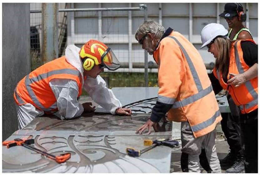 An especially meaningful aspect of this project was the etching on the headwall. Tangaroa, God of The Sea, now overlooks the Saxton Creek culvert, represented by Toi Māori artworks designed by Nelson artist Isaac Andersen (Ngāti Kuia, Ngāti Porou). The design, symbolising the taonga species that thrive in the Saxton Tidal Creek area.